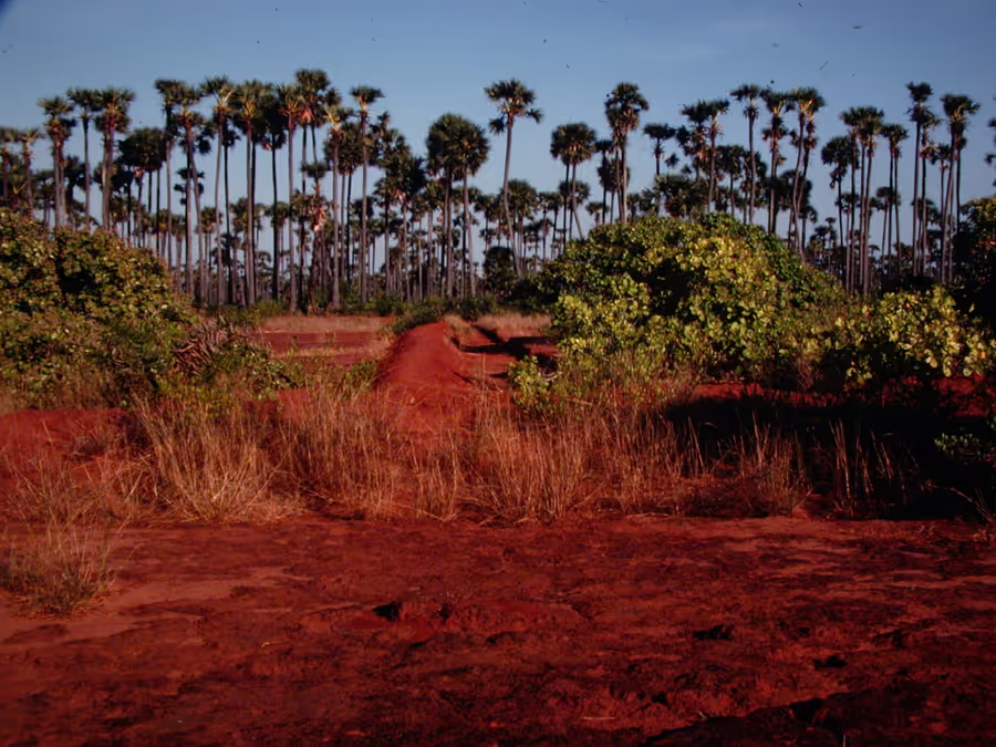 Cashew field in foreground, palmyras in background