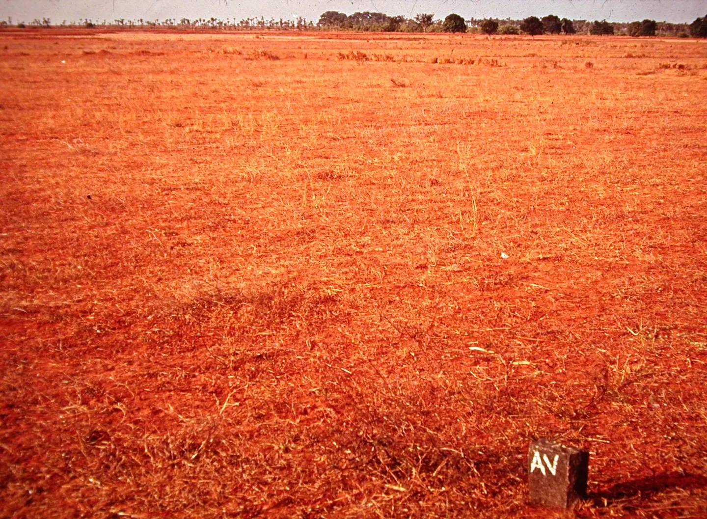 "Auroville boundry stone marker at open field," 1968, web.auroville-archives/ark/64641/133929