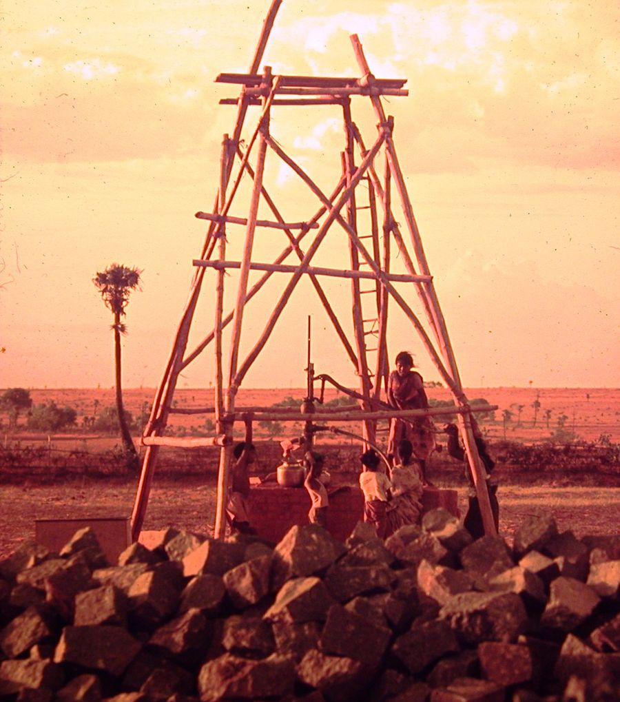 Woman and children using handpump under scaffolding, 1972