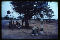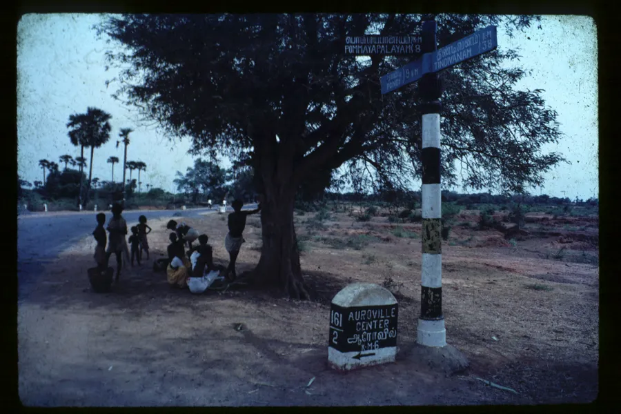 "Road junction signs with people waiting," null, web.auroville-archives/ark/64641/92529